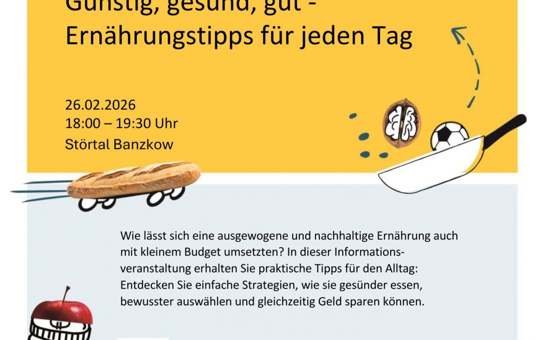 Wir laden euch zu einer Informationsveranstaltung mit der Verbraucherzentrale ein. Sie findet am 26.02.2026 bei uns im Störtal Banzkow um 18:00 Uhr statt. Das Thema lautet: “Günstig, gesund, gut – Ernährungstipps für jeden Tag”.