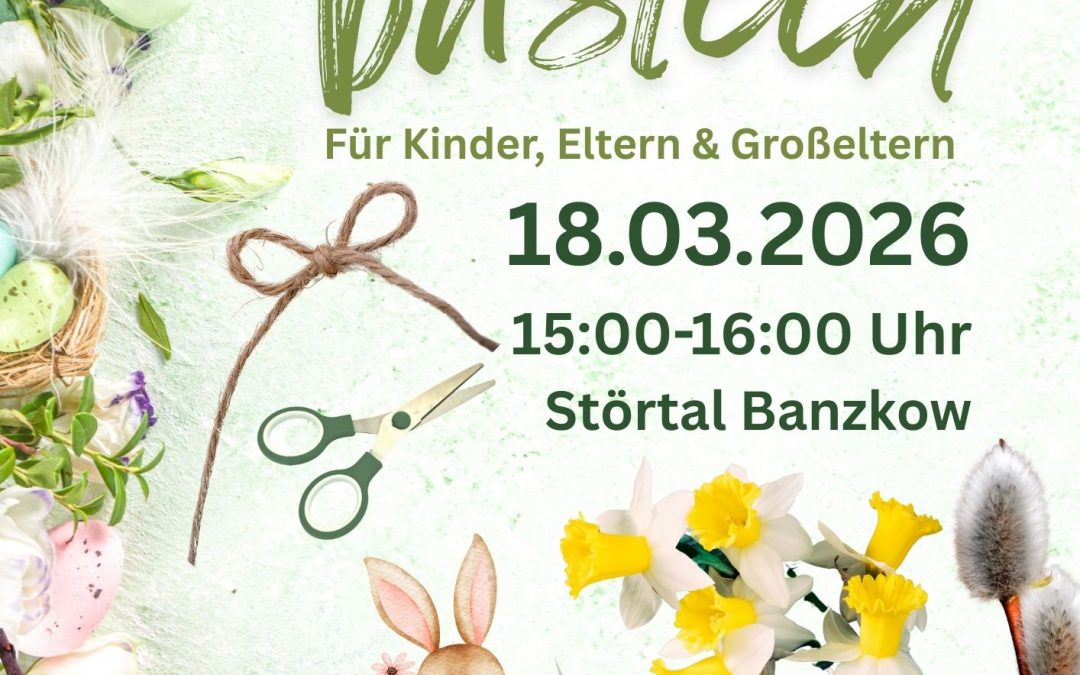 Kinder, Eltern und Großeltern dürfen sich freuen, denn wir bieten wieder unser Osterbasteln an. Am 18.03.2026 in der Zeit von 15:00 bis 16:00 Uhr werden wir mit euch kreativ, natürlich bei uns im Störtal Banzkow. Also seid gespannt!